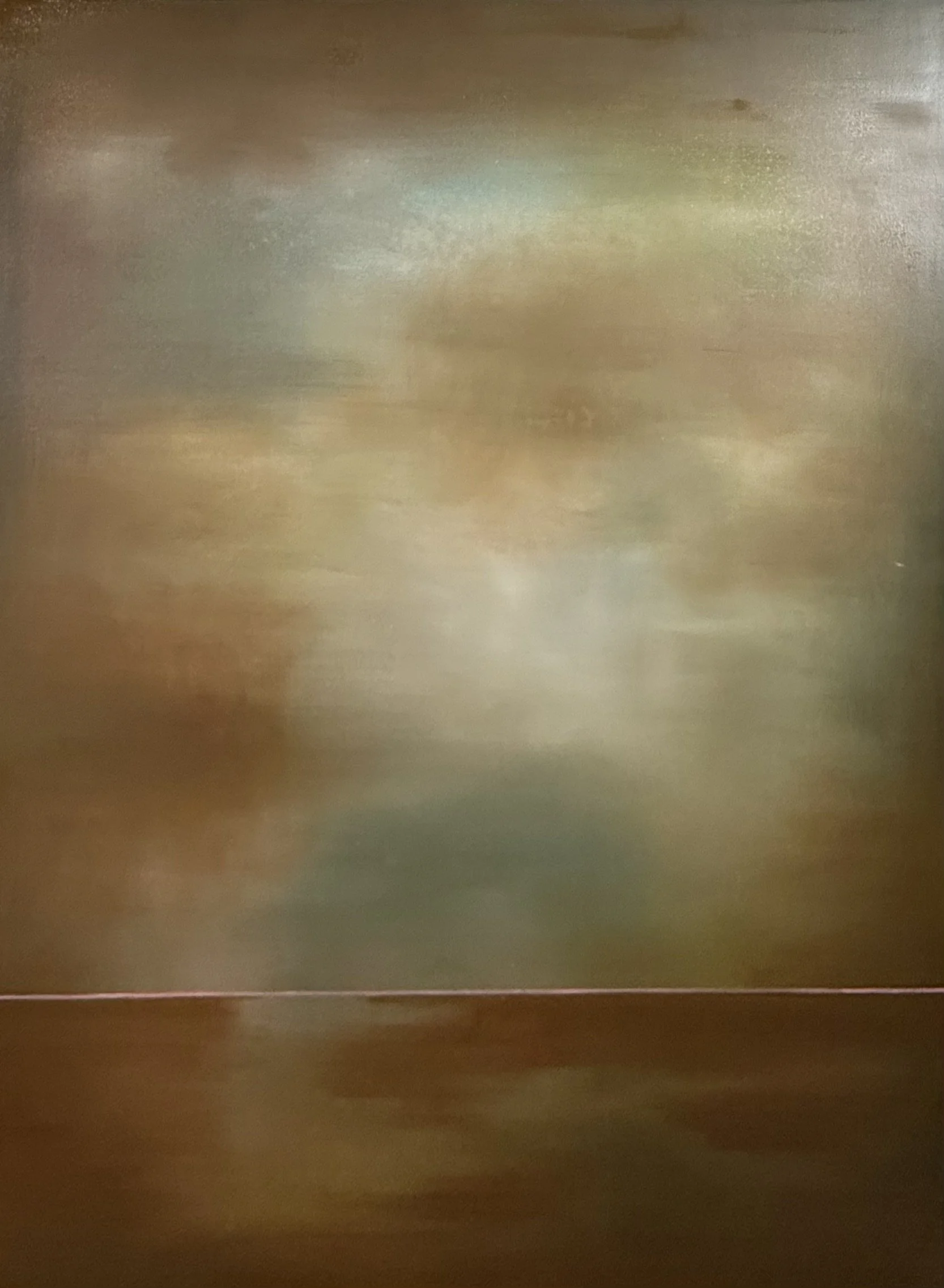 Combining layers of aquamarine, turquoise and cream this piece brings depth and boldness to a new level. It will surely pop against any background. Painted using oil sticks and acrylics and measuring 60”x48”.